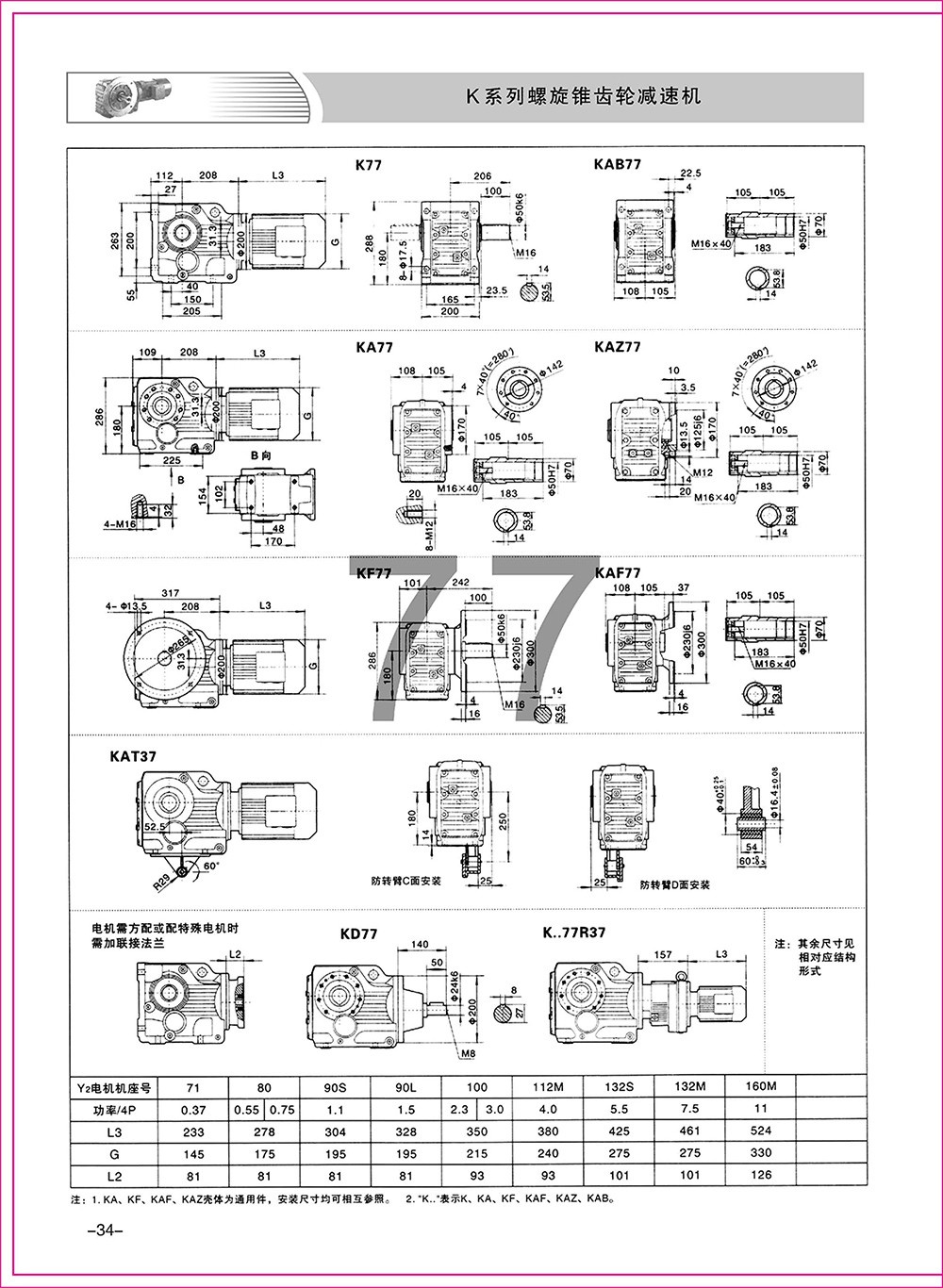 結(jié)構(gòu)形式:K-軸伸式、底腳安裝;KA-軸裝式聯(lián)接;KF-軸伸式、法蘭安裝;KAF-軸裝式、法蘭安裝;S-表示軸輸入。
