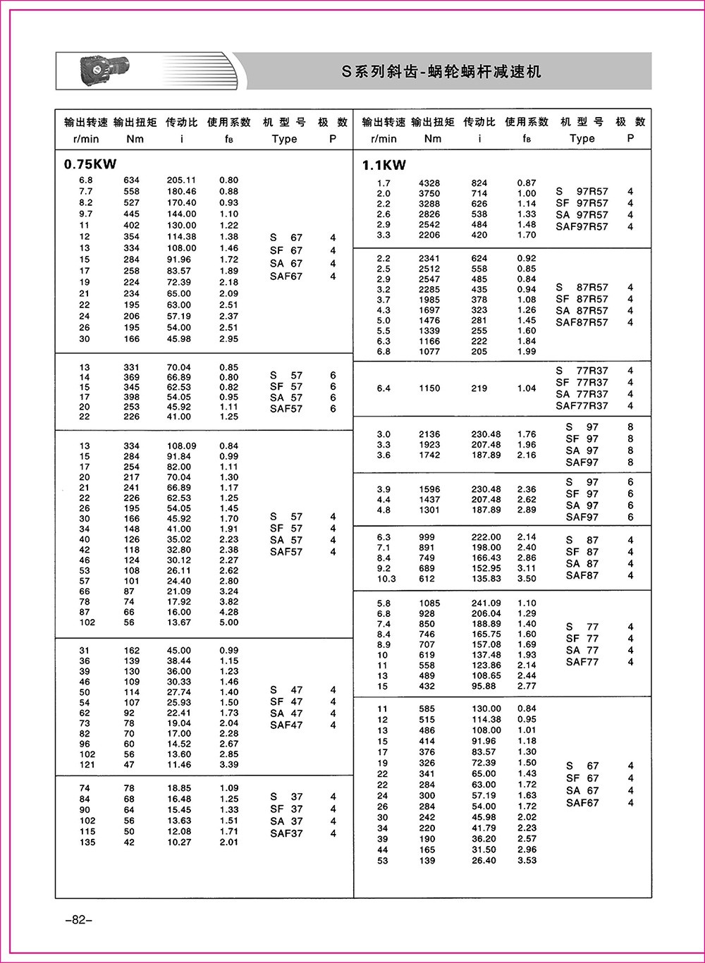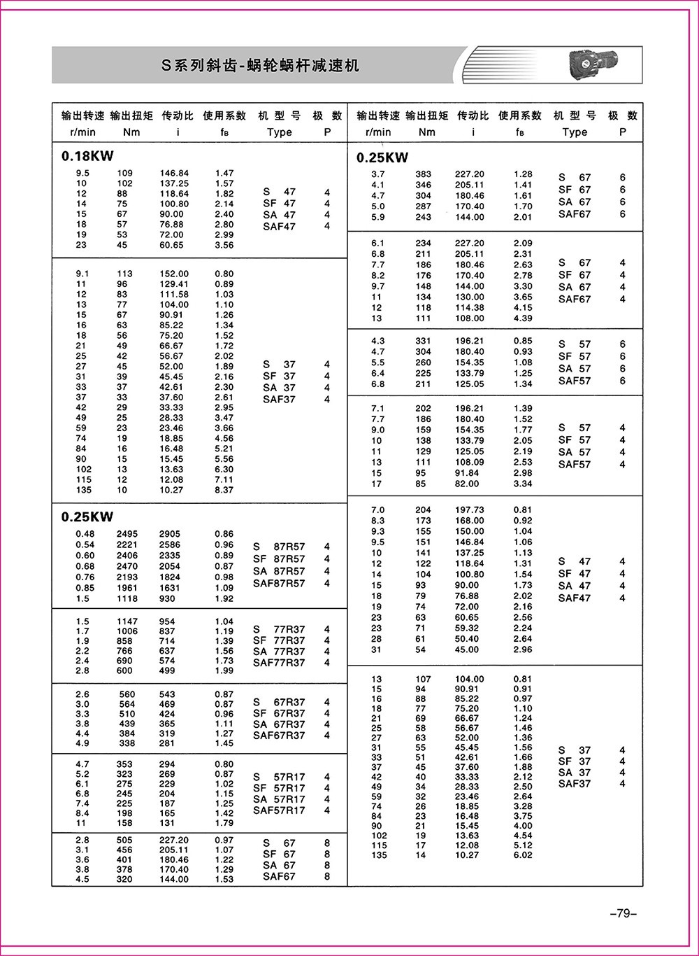 | 性能特點(diǎn): | ◆ 斜齒輪和蝸輪組合,結(jié)構(gòu)緊湊,減速比大。 ◆ 安裝方式:底腳安裝、空心軸安裝、法蘭安裝、扭力臂安裝、小法蘭安裝。 ◆ 輸入方式:電機(jī)直聯(lián)、電機(jī)皮帶聯(lián)接或輸入軸、聯(lián)接法蘭輸入。 ◆ 平均效率:減速比7.5-69.39是77% ;70.43-288是62% ;S/R組合式是57%。 ◆ 和R系列組合能得到更大的速比。 |
