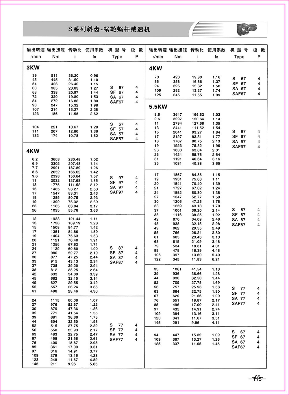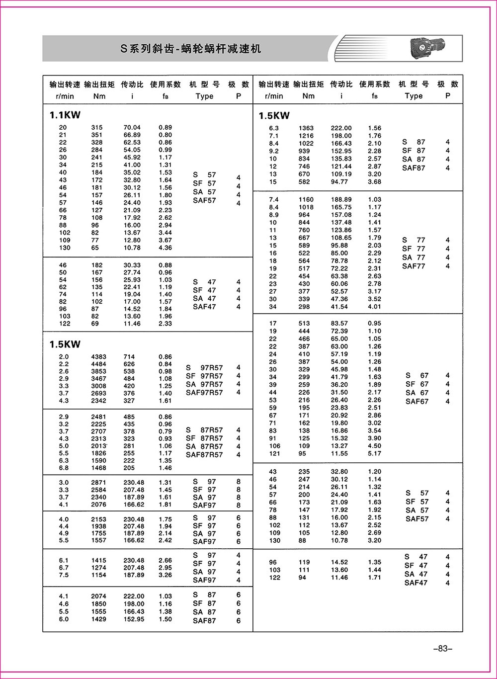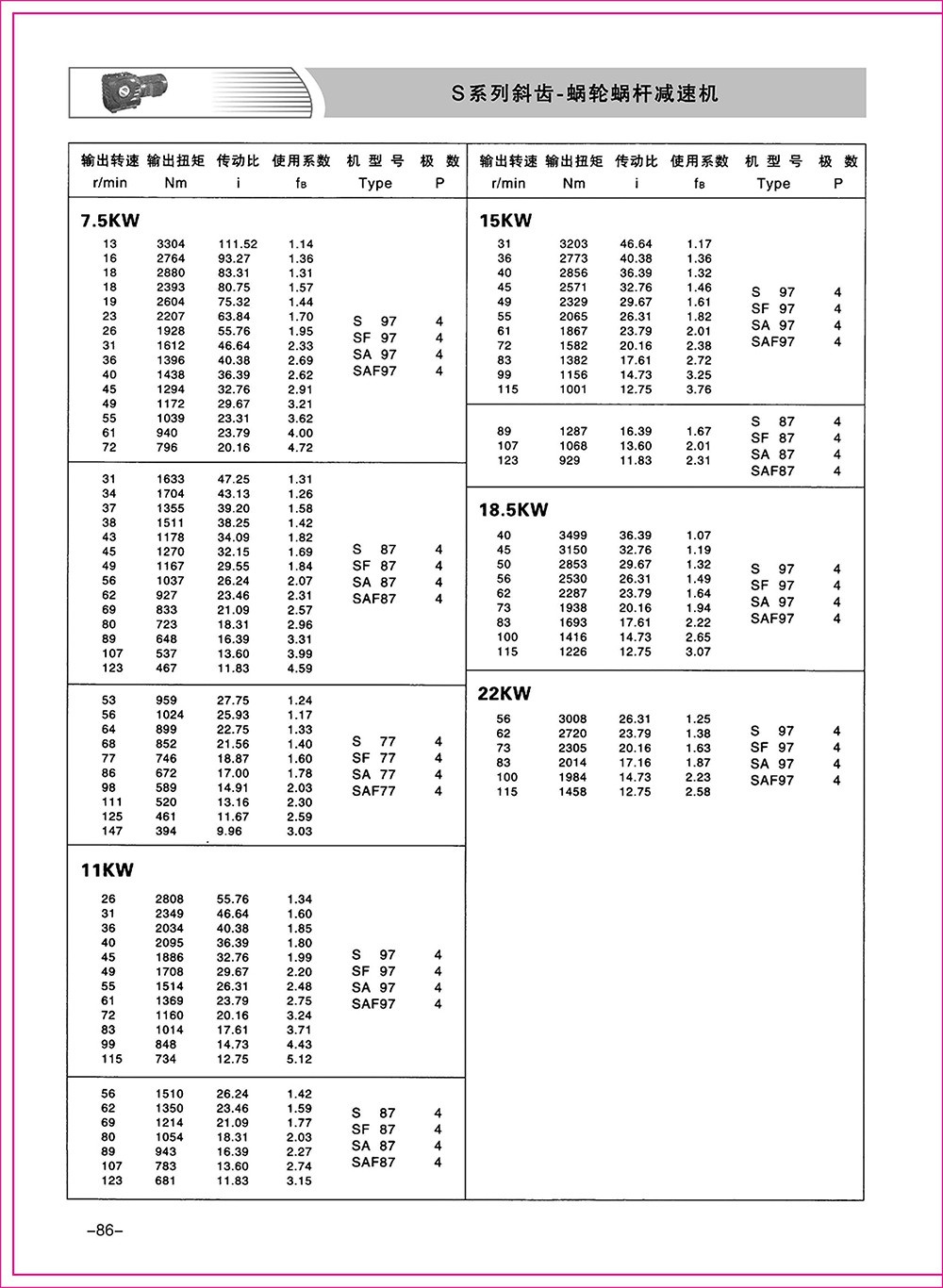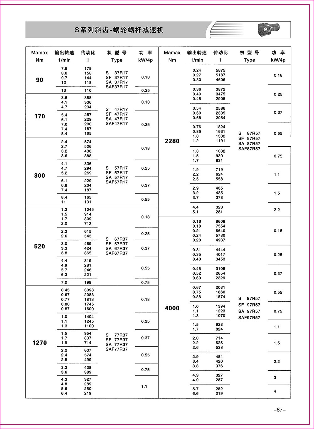 | 技術(shù)參數(shù): | 速比范圍:基本型9.96~244.74,S/R組合型可達(dá)到8608 扭矩范圍:43~4200 Nm 功率范圍:0.18~22 kW |